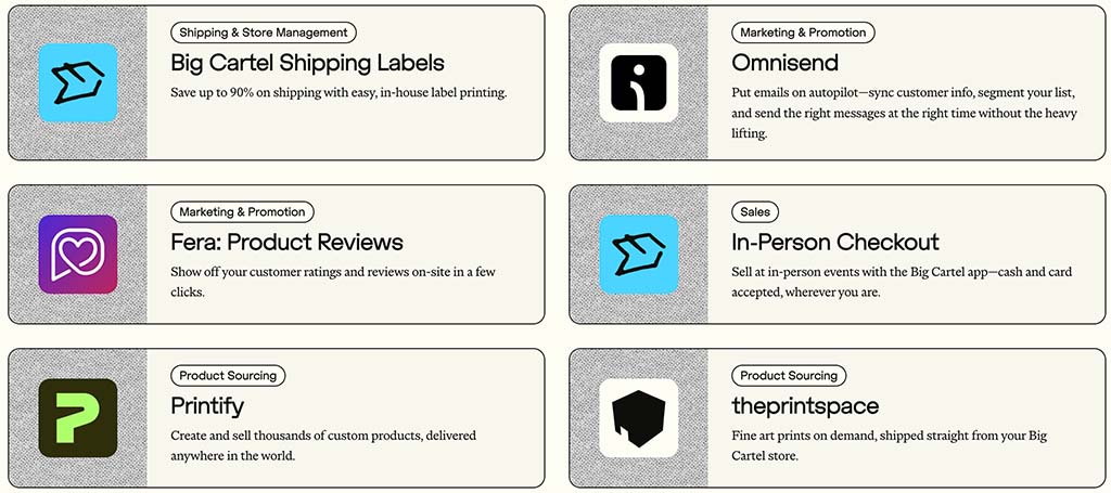 - Its app store contains far more integrations and add-ons than Big Cartel’s.