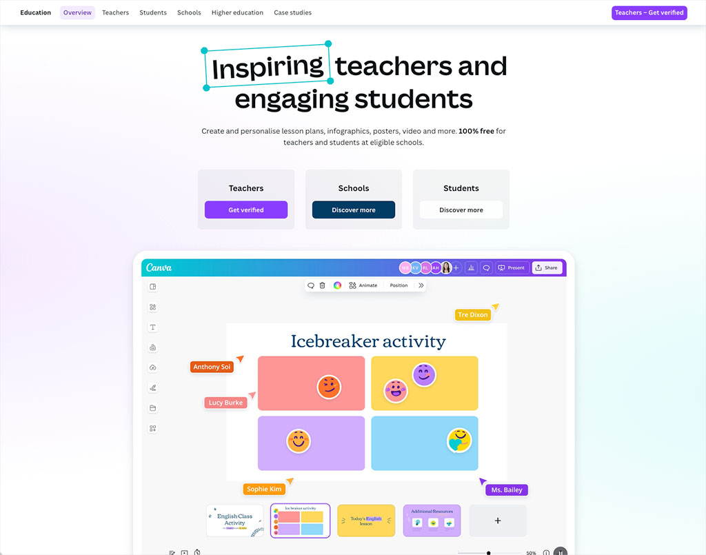 ‘Canva for Education‘ is free for ‘K-12’ teachers and students (with ‘K-12’ referring to US education levels that stretch from Kindergarten to 12th grade).