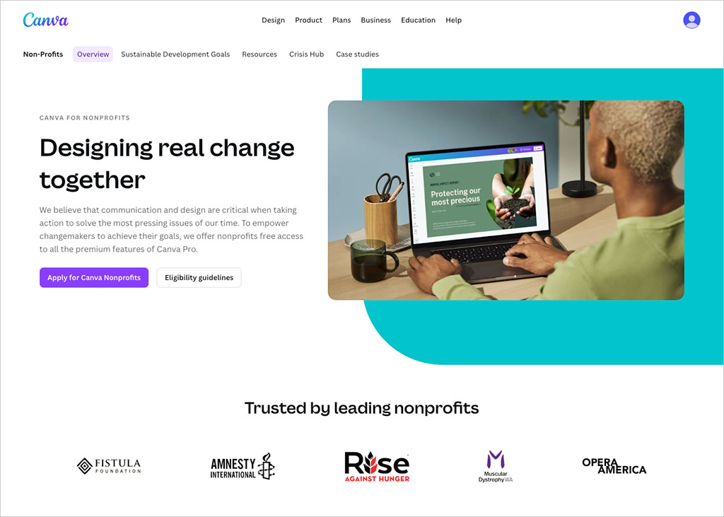 As its name suggests, ‘Canva for Nonprofits‘ is a version of the platform that’s free for those working in the charity sector. It can be used for free by up to 50 people (depending on the type of organization), with extra seats available at a 50% discount.