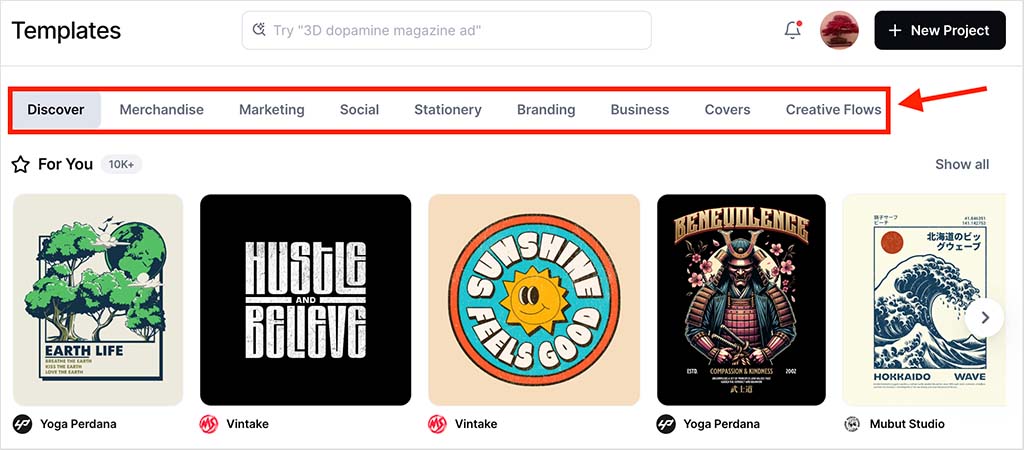 By contrast, Kittl’s templates are mostly categorized based on different artistic themes (‘beauty,’ ‘nature’ fashion,’ etc.) and style (‘cartoon,’ ‘bauhaus,’ psychedelic,’ etc.).